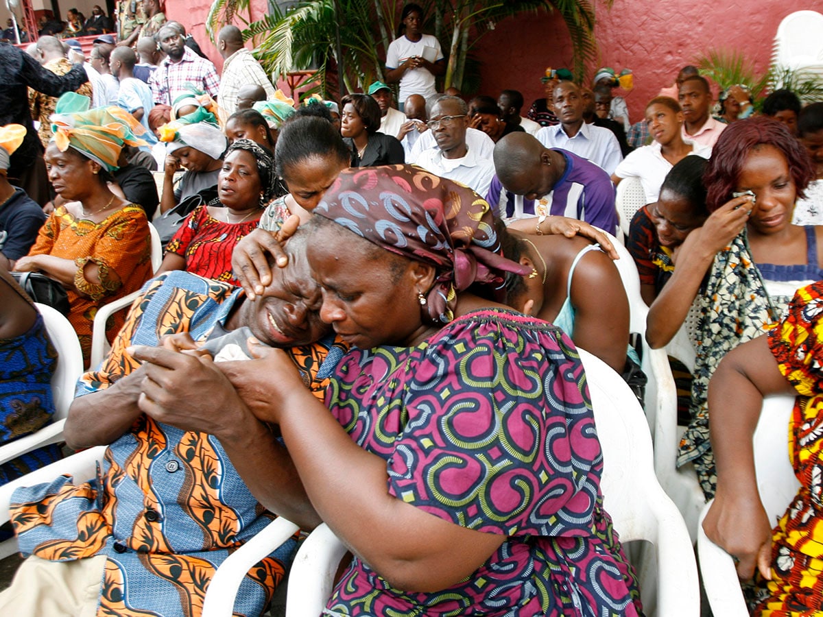 Friends and relatives of the victims of a stadium crush attend a memorial at Felix Houphouet Boigny stadium in Abidjan April 1, 2009. At least 19 people were killed in the crush during a World Cup qualifier between Ivory Coast and Malawi in Abidjan on March 29, 2009. Image: REUTERS/Luc Gnago