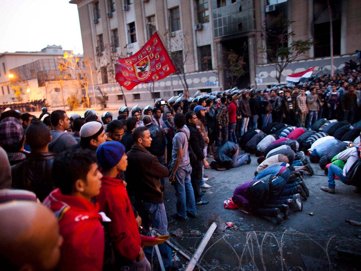 Protesters pray as they are blocked by police on their way to the interior ministry after a demonstration outside Cairo"s Al Ahly football stadium on February 2, 2012 in Cairo, Egypt. The protest follows the deaths of 74 football fans who were killed in clashes between rival fans following the match between al-Masry and al-Alhy in Port Said, Egypt. Three days of mourning have been announced and marches are scheduled to protest at the lack of protection provided by police who were at the stadium when the violence occurred. Image: Carsten Koall/Getty Images