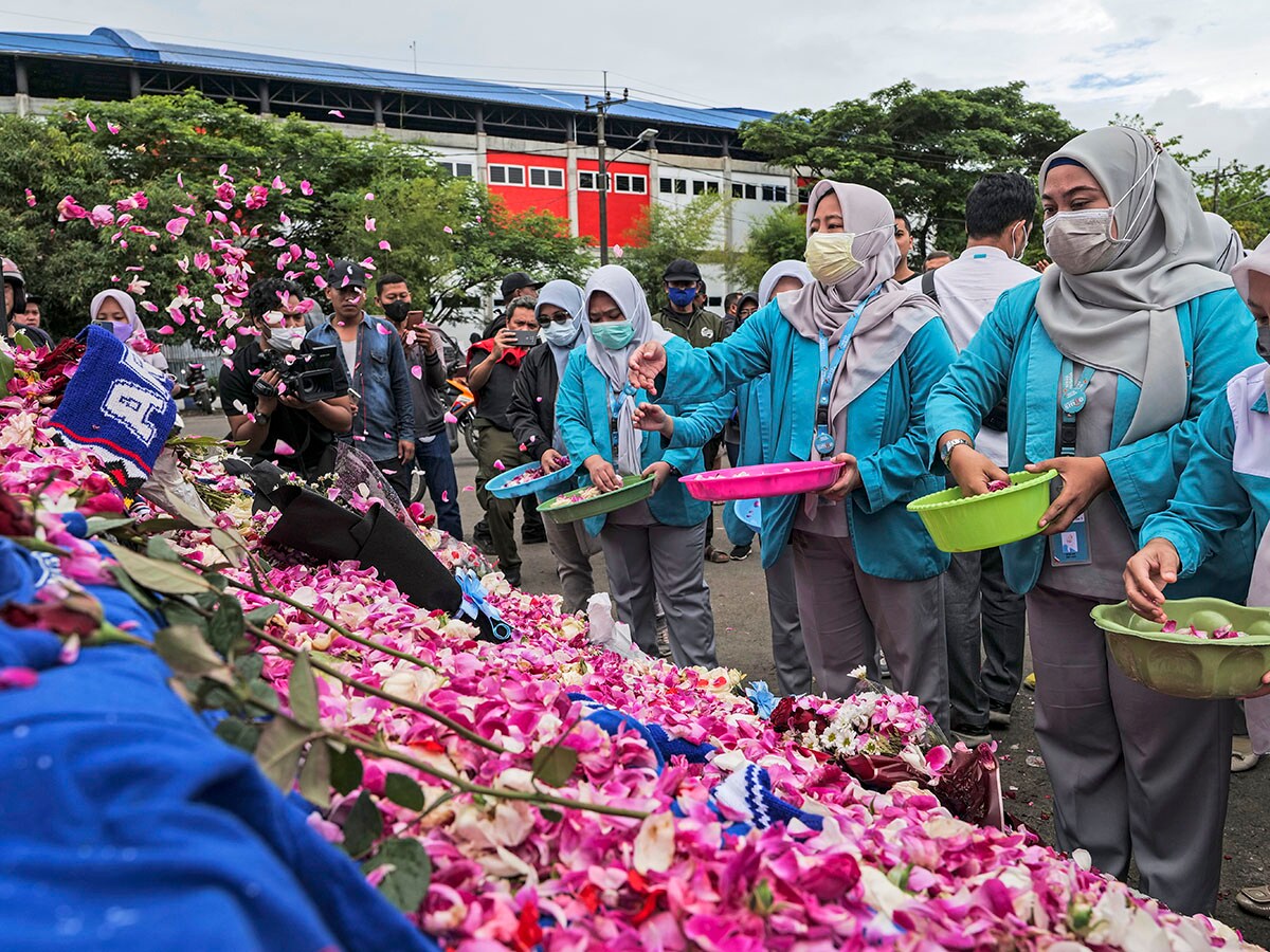 Supporters and people lay flowers as they pay condolence to the victims outside Kanjuruhan Stadium on October 03, 2022 in Malang, Indonesia. A riot and stampede broke out at a football stadium in East Java on Saturday. Police fired tear gas to disperse fans who had invaded the pitch and began fighting after the match ended. A stampede for the exits has resulted in at least 125 deaths, local media reports said, with many still injured in hospitals. Image: Ulet Ifansasti/Getty Images