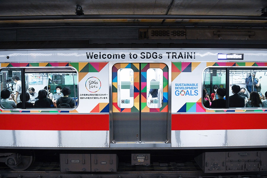 A subway train in Tokyo promoting the United Nations’ Sustainable Development Goals campaign, Aug. 19, 2022. With the support of Japan’s biggest business federation, Keidanren, the country has embraced the U.N. campaign to aspire to become a better place by ending poverty, improving education and reducing inequality. (Noriko Hayashi/The New York Times)