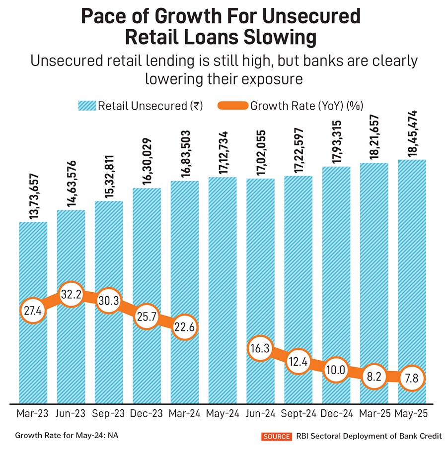 India’s banks across categories have in recent quarters seen the pressure of microfinance hurt asset quality and quarterly margins. The pressure of unsecured retail lending (which comprises credit cards, other personal loans and consumer durables) is being seen over the past three financial years. The growth rate of unsecured retail loans is now at 7.8 percent in May from a high of 32.2 percent in June 2023 (see chart).