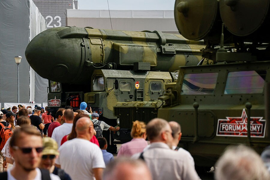 Visitors walk past a Topol-M silo-based intercontinental ballistic missile at the International Military-Technical Forum ARMY-2023 at Patriot Centre in Moscow, Russia, on August 18, 2023. The diamond ban is G7"s essential step to greatly reduce the flow of money from the diamond trade towards Russia, which is funding President Vladimir Putin"s war against Ukraine. It is also an attempt to close a loophole involving Indian trade. After Russian diamonds are cut and polished in India, they are considered to originate here rather than in Russia.