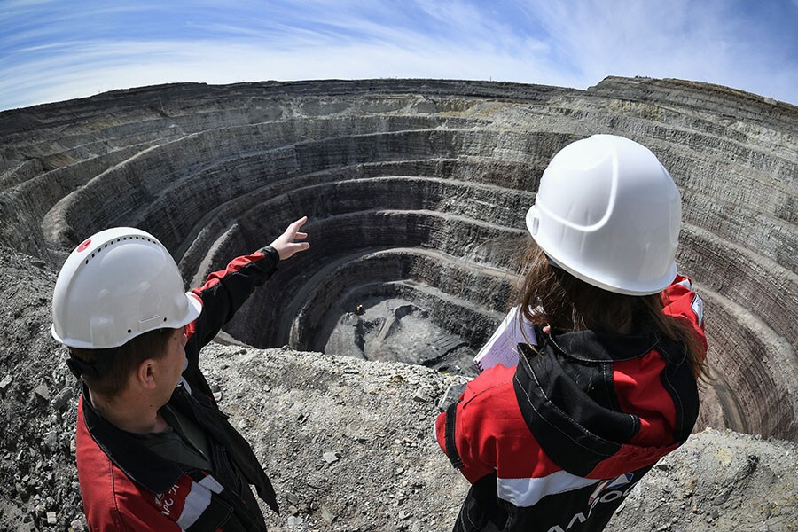 Employees inspect the Nyurbinsky diamond mining pit of Nakyn diamond ore field, one of Alrosa"s main production sites in the permanently frozen ground of Yakutia, an isolated region in East Siberia, Russia. Mines in Russia"s Siberia are the world"s biggest producer of rough diamonds by volume, with a 30 percent share of the global supply, valuing around $4 billion. Over 90 percent of these diamonds are produced by the Russian state-owned Alrosa, the second-largest diamond producer in revenue after DeBeers. The US imposed sanctions on Alrosa last April, soon after Russia invaded Ukraine.