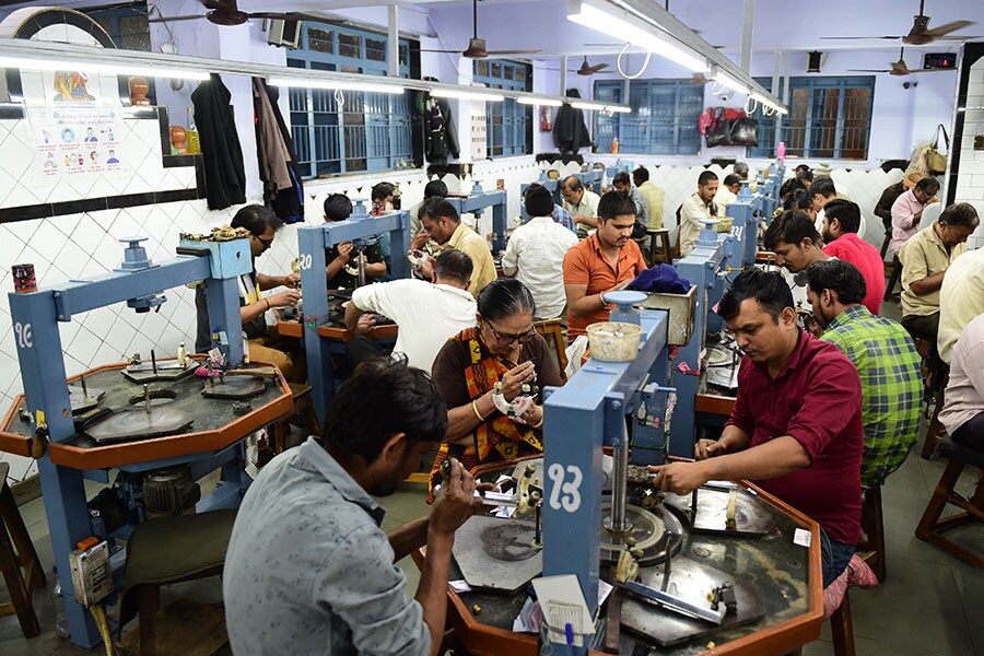 Workers work polish diamonds at a small enterprise workshop in Ahmedabad on January 10, 2023. India"s diamond industry, headquartered in Surat and spread in Mumbai, Saurashtra, Ahmedabad and Rajasthan, employs up to 800,000 polishers. The restrictions announced recently will significantly impact the cut and polished diamond exports from India. Indian trade body GJEPC has strongly advocated that the interests of SMEs (small and medium enterprises) and marginal diamond units be kept in mind while imposing the sanction, recognising their active contribution to the industry and the millions of livelihoods dependent on it. The artisans at the bottom of a highly valued, glamorous industry will be the ones to bear the brunt amidst this global upheaval.