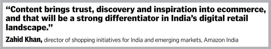 Zahid Khan, director of shopping initiatives for India and emerging markets, Amazon India, sees content as a long-term differentiator in India’s ecommerce space. Amazon India has launched creator programmes through which the platform is actively integrating more video, influencer and editorial content throughout the entire customer journey (from discovery to consideration and purchase) both on its website and across its social media platforms. The programme engages over 100,000 creators across various categories, which create shoppable content on social media apps.