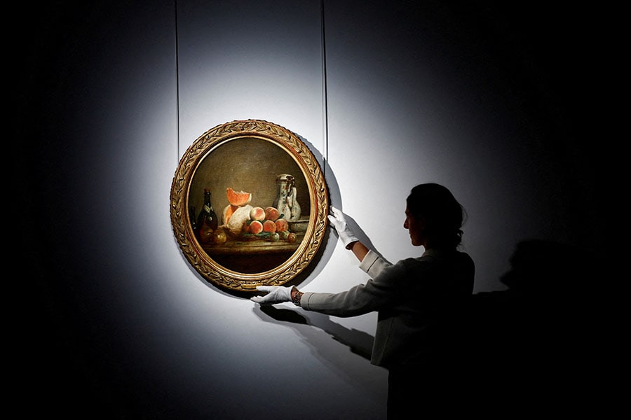 A Christie"s employee adjusts the painting "Le melon entamé, 1760" by Jean Simeon Chardin (1699-1779) during its presentation before the auction at Christie"s auction house in Paris, France, on April 5, 2024. In a sense, the painting"s circular format is an ode to roundness, encapsulating the balance of composition, light, colour, and shape of the fruit itself.