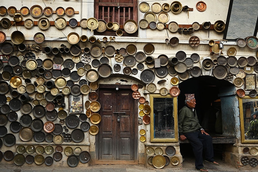 Handmade copper and brassware plates are displayed in Chobar Machhindranath temple in Kirtipur on the outskirts of Kathmandu on April 2, 2024. Brass plates are used in traditional Nepali households as Pooja and serving plates.