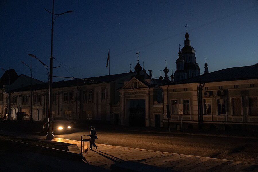 A person walks in the dark during a blackout following Russian attacks on the city"s energy infrastructure in Kharkiv on April 8, 2024, amid the Russian invasion of Ukraine. This type of bombing, causing Kharkiv"s 1.3 million residents to face an average of six hours without electricity daily, has been labelled a war crime by the European Commission (EC).