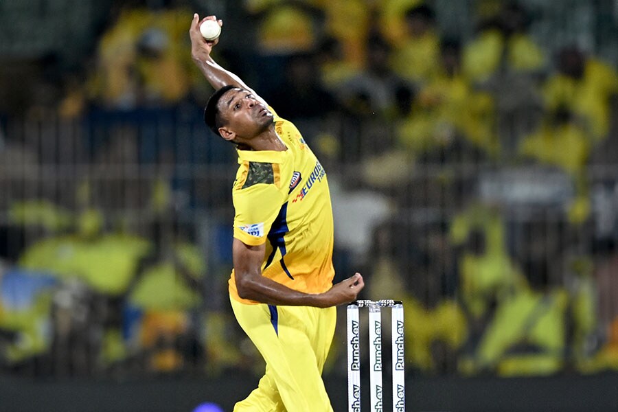 Chennai Super Kings" Mustafizur Rahman in action during an Indian Premier League (IPL) Twenty20 cricket match. CSK"s Bangladesh pacer climbed atop the Purple Cap table with nine wickets after Chennai Super Kings vs Kolkata Knight Riders match in Chennai on April 8, 2024.