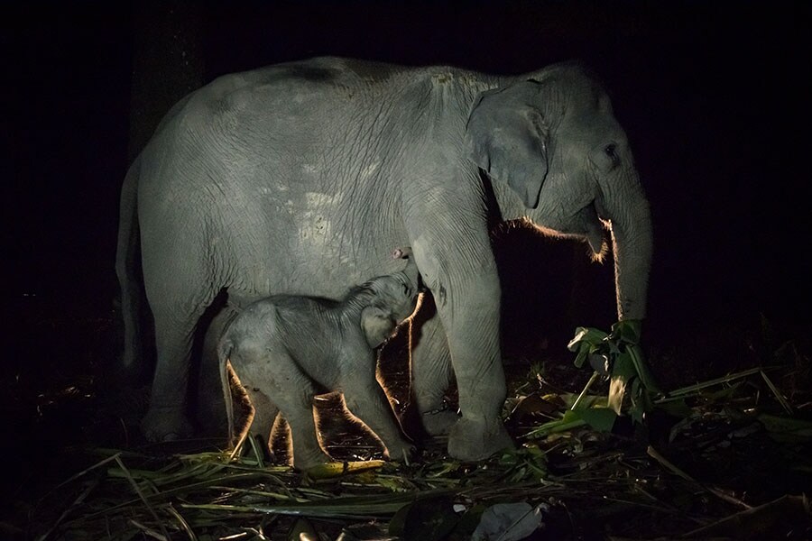 A 75 kg newborn female Sumatran elephant stands next to her mother, a 20-year-old elephant named Puja, at the Sebanga Elephant Conservation Center in Bengkalis, Indonesia, on April 6, 2024.
