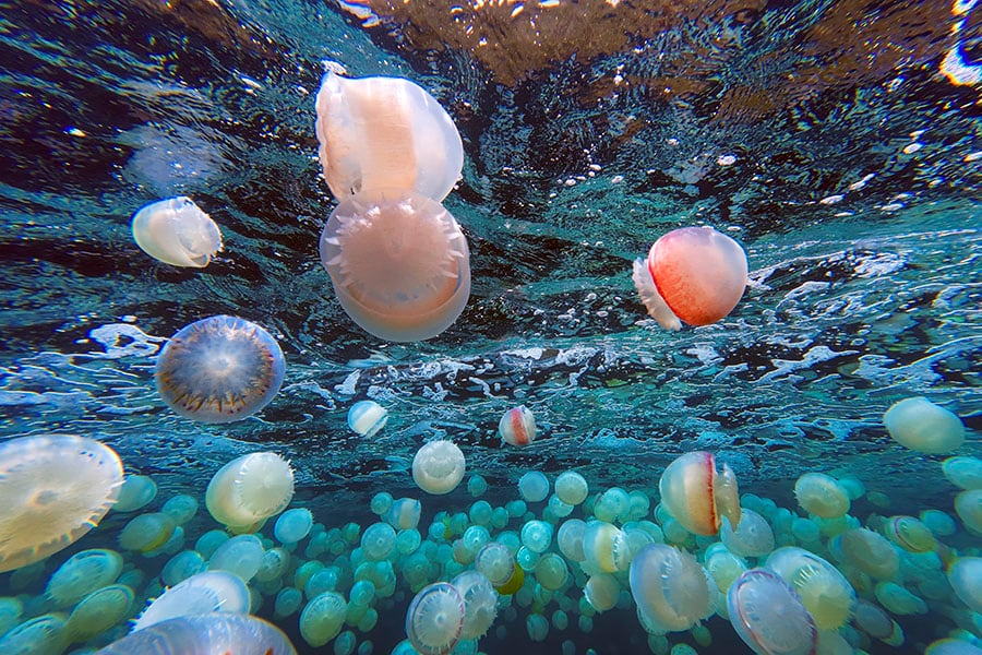 The invasive cannonball jellyfish (Stomolophus meleagris) is pictured off the coast of Chuao, Aragua State, Venezuela, on April 5, 2024. Hundreds of jellyfish are afloat in the turquoise waters of Aragua, a surreal scene attributed to warming waters from climate change. Climate change has decimated fishing stocks, causing much worry to the fishermen on the Venezuelan coast.