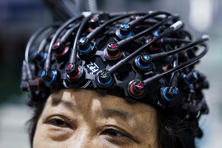 This photo, taken on April 7, 2024, shows a woman wearing a brain monitoring machine by the Chinese company Yiruide Group at the 2024 World Health Expo in Wuhan, in central China"s Hubei province.