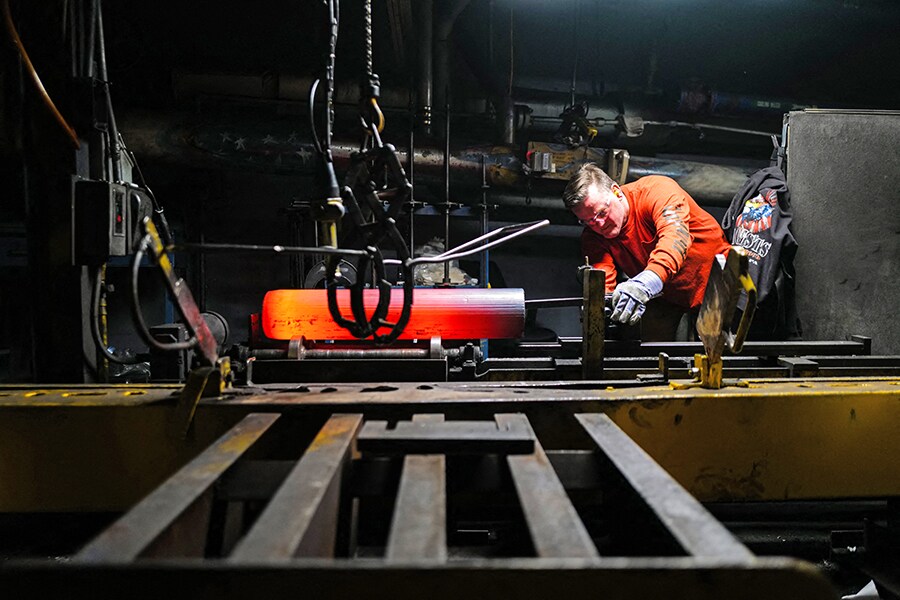 A worker inspects the form and shape of steel billets during the manufacturing process of 155 mm caliber shells at the Scranton Army Ammunition Plant (SCAAP) in Scranton, Pennsylvania on April 16, 2024. In brick buildings that are more than a century old, dated machinery churns out artillery for modern conflicts, especially the war in Ukraine. The Scranton Army Ammunition Plant (SCAAP) is making steel tubes for 155 mm caliber shells, which are crucial to Kyiv"s efforts to face down Moscow"s invasion.