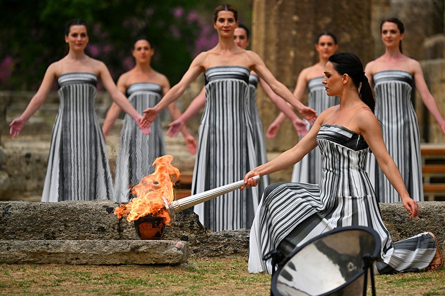 Greek actress Mary Mina, playing the role of the High Priestess, lights the torch during the flame lighting ceremony for Paris 2024 Olympics Games at the ancient temple of Hera on the Olympia archeological site, birthplace of the ancient Olympics in southern Greece, on April 16, 2024.