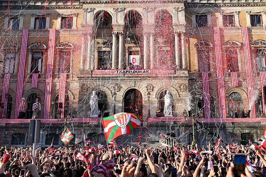 Athletic Bilbao"s supporters cheer as the team stands on the balcony of Bilbao"s townhall on April 11, 2024, during the celebration of their victory in the Spanish Copa del Rey (King"s Cup). The Club lifted the trophy for the 24th time, ending a 40-year wait to get their hands on the Copa del Rey.