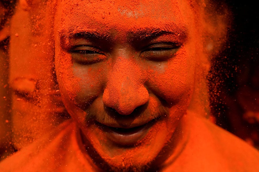 A devotee celebrates the "Sindoor Jatra" festival to welcome the arrival of spring and Nepali New Year at Thimi in Bhaktapur, Nepal, on April 14, 2024. The ancient town comes alive as vermilion and flowers are showered on the procession of chariots and people from windows and roofs of houses.