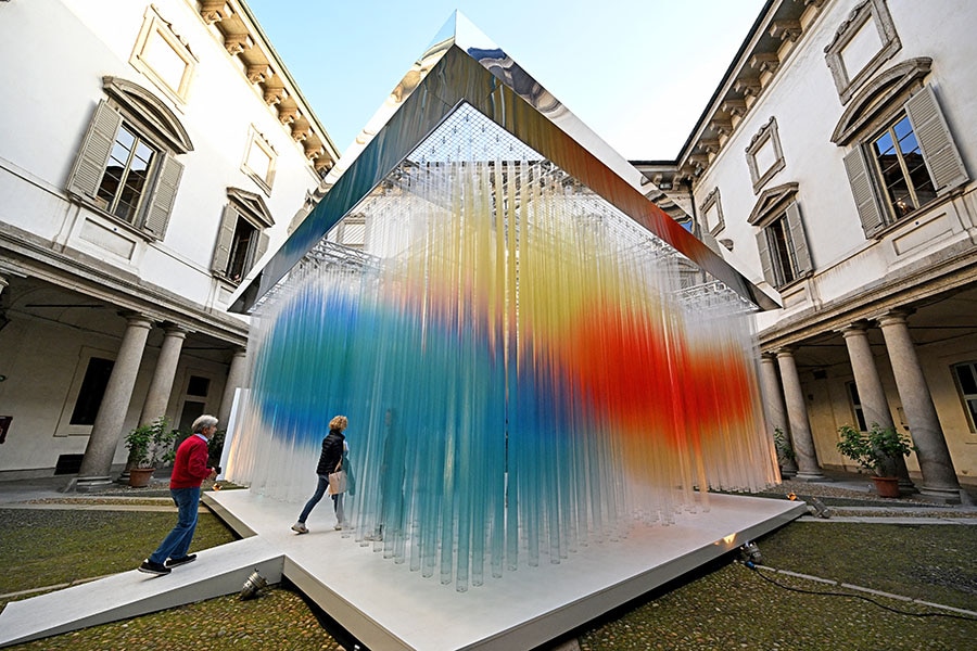 Visitors look at the artwork "Straordinaria", an immersive installation presented by the Italian company Elica as part of the Fuorisalone 2024 event, on the eve of the Milan Design Week, in Milan, on April 15, 2024. Designed by Japanese design studio we+, the installation takes its inspiration from the lightness of clouds, creates a continuous flow of alternating hues evoking air and heat.