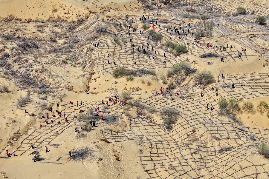 An aerial view of volunteers planting salix to curb desertification of Kubuqi Desert in Ordos, Inner Mongolia of China on April 16, 2024. A sustained programme of planting tall salix mongolica on one side of the dunes and Artemisia desertorum with developed roots has taught the locals that the desert can be made to ‘disappear’.