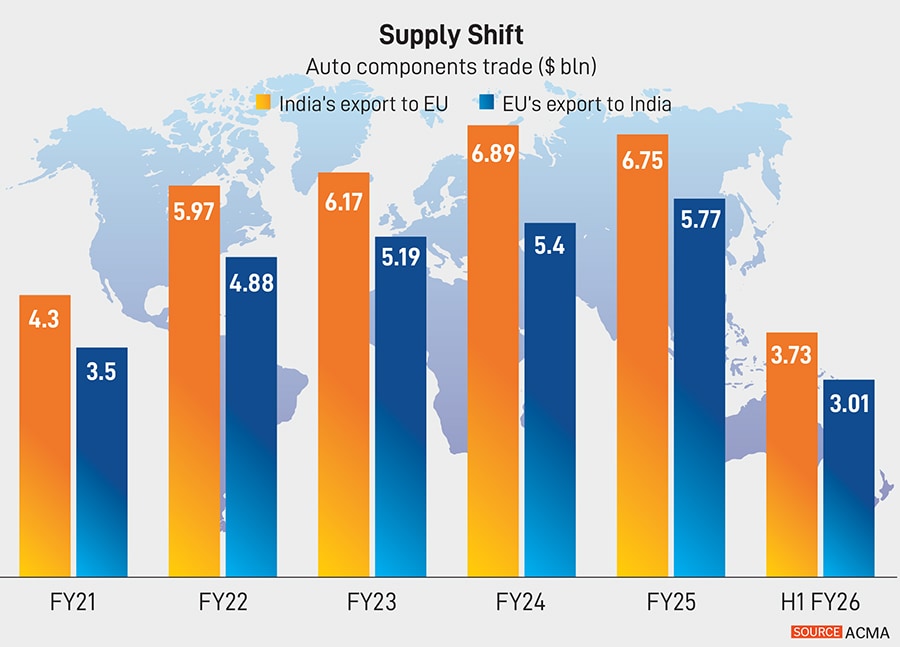Indian suppliers already export billions of dollars’ worth of parts to Europe, with exports of about $3.7 billion in the first half of FY26 alone, according to Grant Thornton. The EU accounts for nearly 30 percent of India’s component exports, according to the Automotive Component Manufacturers Association of India (ACMA).