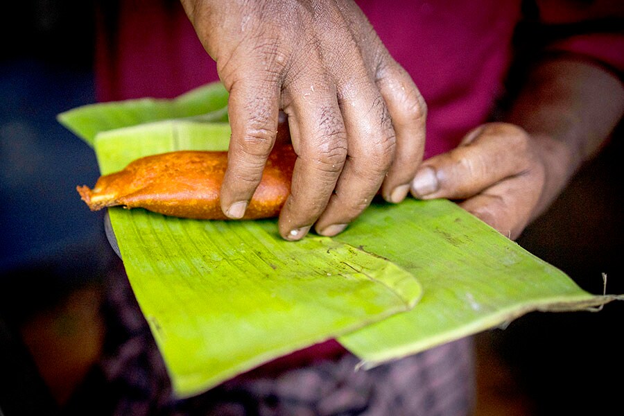 A roadside vendor serves food on banana leaves, a traditional way of plating or wrapping that is gaining popularity in the face of a ban on disposable plastics, in Chennai, India, July 7, 2022. India’s state of Tamil Nadu was not the country’s first to try to curtail plastic pollution, but unlike others it was relentless in enforcing its law. (Anindito Mukherjee/The New York Times)