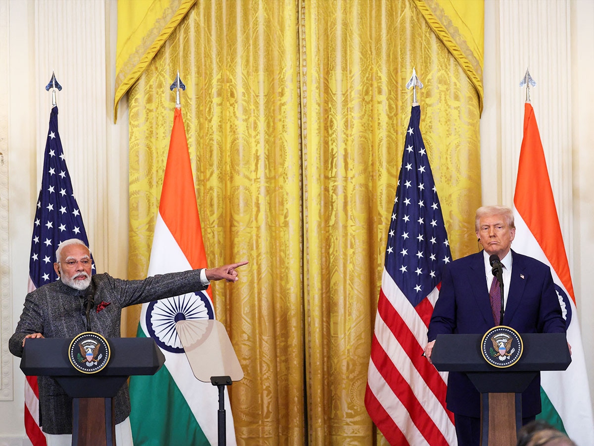 Indian Prime Minister Narendra Modi gestures during a joint press conference with U.S. President Donald Trump at the White House in Washington, D.C., U.S., February 13, 2025. REUTERS/Kevin Lamarque