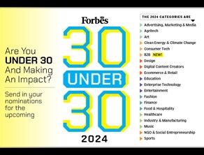 1) Forbes India 30 Under 30 2024 With 30 Under 30, Forbes India strives to find exceptional young entrepreneurs and professionals annually. We look for dynamic personalities who have made significant strides in the field in which they operate. There are 20 categories this year—from advertising to sports—with a new addition of B2B or business-to-business. If you are that exceptional individual or you know somebody who meets the criteria, it is time you brought them the spotlight. The nomination forms for the Class of 2024 are now open. Fill up now.