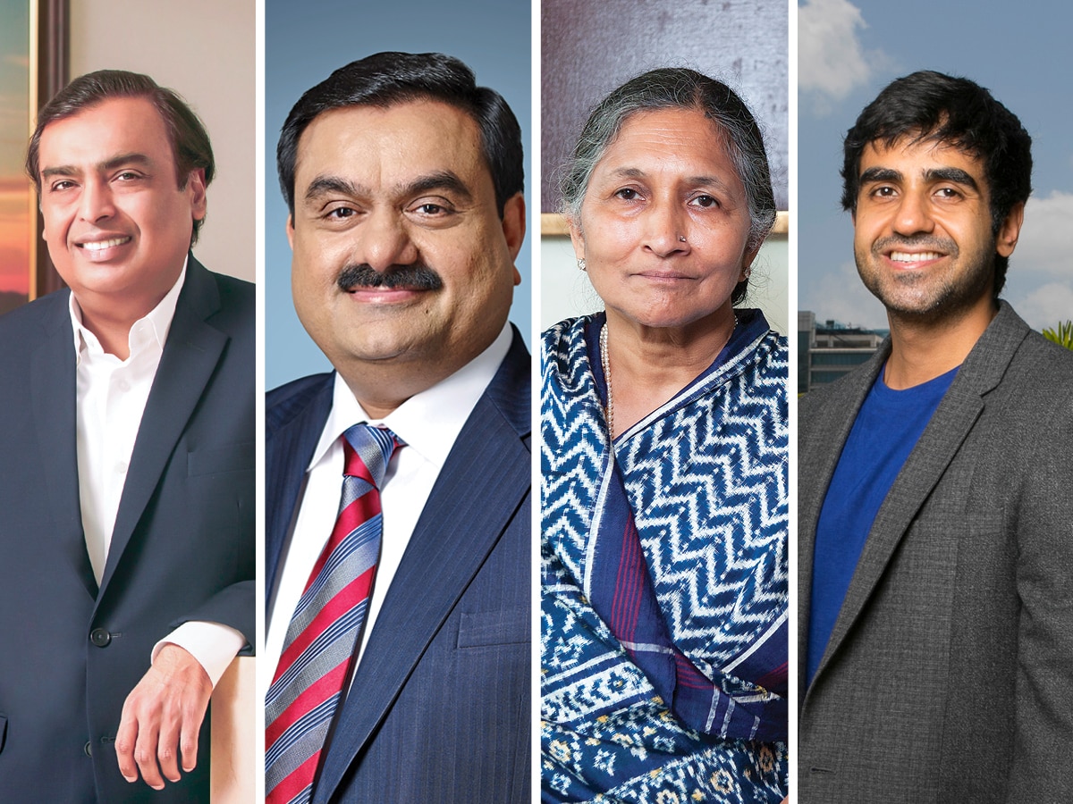 (L-R) Mukesh Ambani, chairman and managing director of Reliance Industries Gautam Adani, founder and chairman of Adani Group Savitri Jindal, chairperson emeritus, JSW Steel, and Nikhil Kamath, co-founder, Zerodha.
