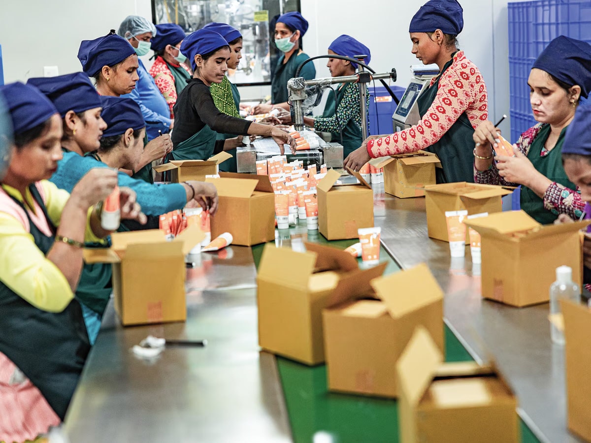 Workers assemble cosmetics tubes at the Indo Herbal manufacturing unit in Haridwar. Image: Madhu Kapparath