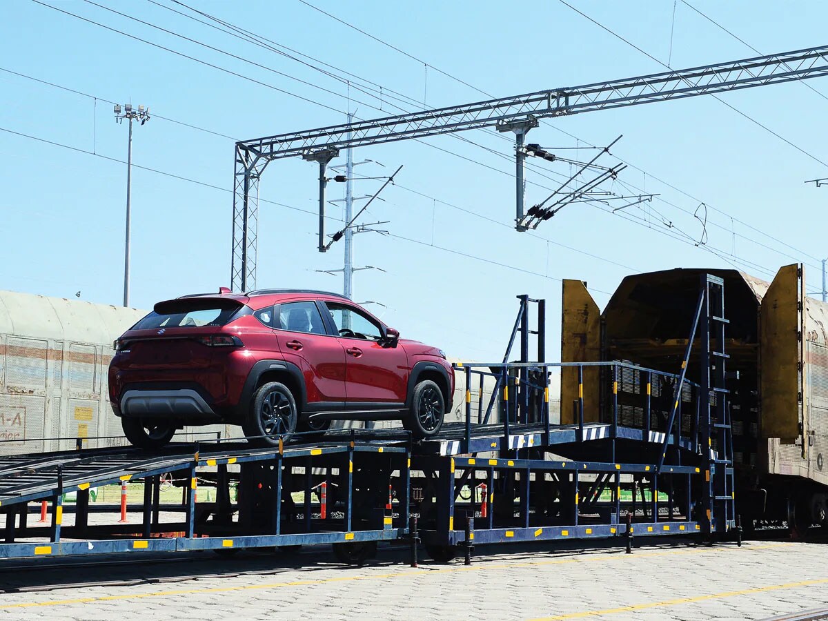 A workers loads a Maruti Suzuki Fronx car model on a train at the Maruti Suzuki Hansalpur plant, some 80 km from Ahmedabad Image: Sam Panthaky / AFP