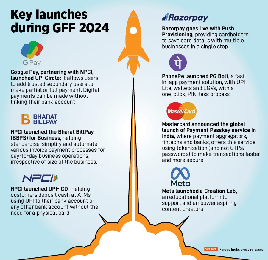 Fintech unicorn Razorpay’s co-founder and CEO Harshil Mathur said his biggest takeaway from the fintech conference was the opening up of two large opportunities: Unified Lending Interface (ULI) and the Bharat BillPay (BBPS) for Business (see GFF key launches). “ULI can democratise credit. We want to distribute credit, get merchants who want loans to connect with lenders," he told Forbes India. The second big opportunity, Mathur said, was B2B payments, which was still very manual and needed to be digitised.