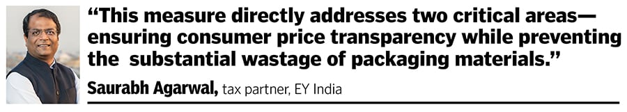 Welcoming the timing of the move, Saurabh Agarwal, tax partner at EY India, says, “This measure directly addresses two critical areas—ensuring consumer price transparency while preventing the substantial wastage of packaging materials.”