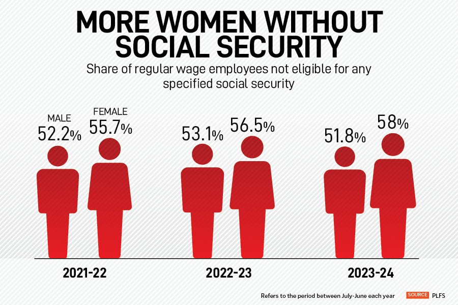 Government data shows that the share of women ineligible for specified social security climbed from 55.7 percent in 2021-22 to 58 percent in 2023-24—outpacing men (51.8 percent) and the overall average (53.4 percent). This trend bucks national gains, where coverage has improved.