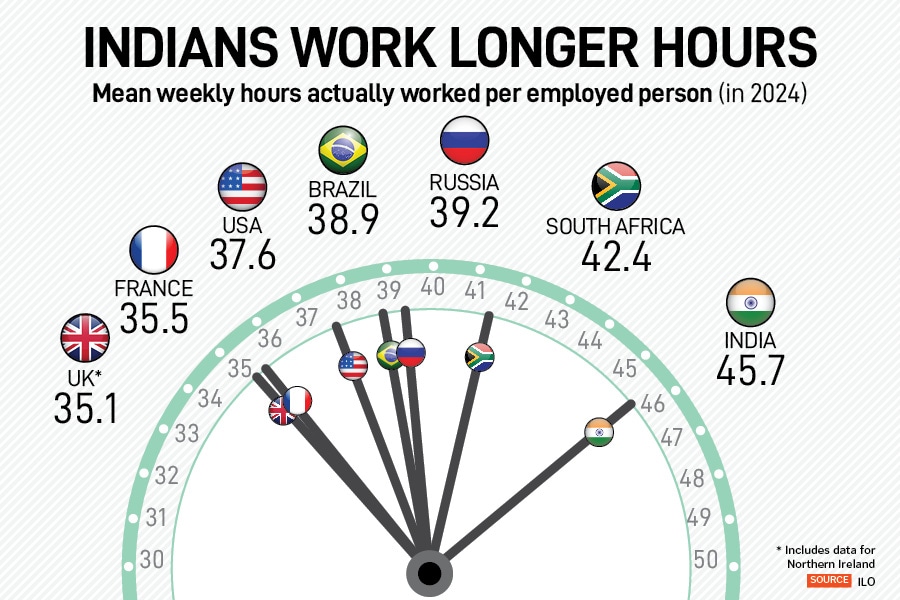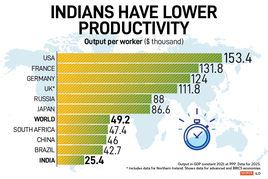 The most striking contradiction lies in India’s work ethic versus its economic output. International Labour Organisation (ILO) data show that average Indian employees work 46 hours a week on an average, longer compared to peers in advanced economies like the United States (37.6 hours) or those in the Brazil, Russia, China and South Africa (BRICS) grouping (South Africa: 42.4 hours).