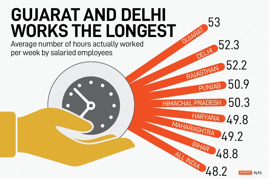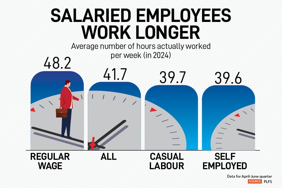 Overall, in India, between 2018 and 2024, while the weekly hours clocked by employees have dropped from 53 to 42, salaried employees still work over 48 hours a week. While those in casual labour work an average of 39.7 hours a week, self-employed work slightly lower at 39.6 hours.