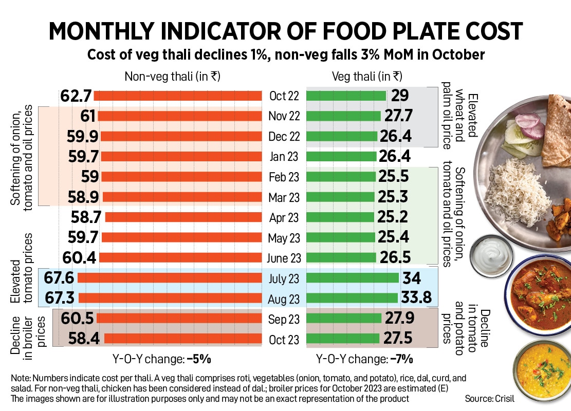 The average cost of a vegetarian thali was Rs27.5 in October, which is around 1.4 percent lower than Rs27.9 in previous month, based on an analysis by Crisil. Compared to October last year, vegetarian thali got cheaper by Rs1.50 or 5.2 percent.