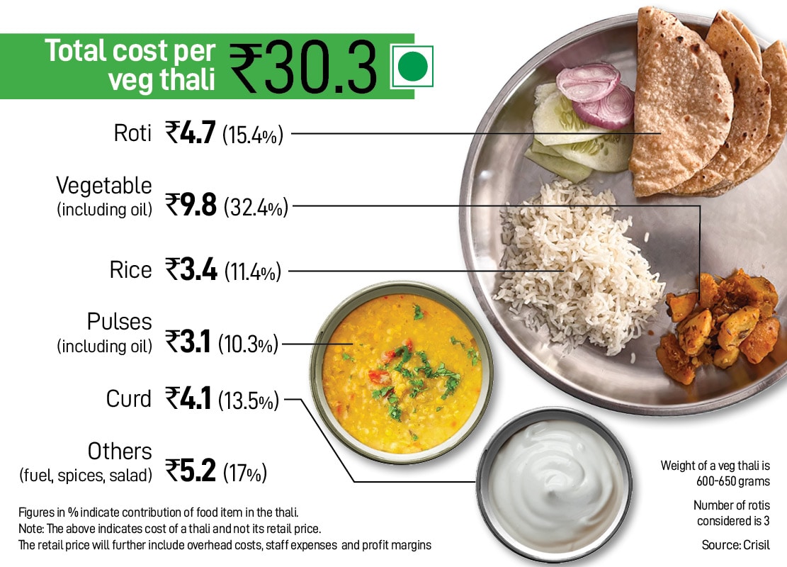 In November, the average price of a vegetarian thali was Rs 30.3, an increase of 10 percent, or Rs 2.80, from previous the month, based on an analysis by Crisil. The same thali cost Rs 27.7 in November last year, indicating a rise of 9 percent, or Rs 2.6.