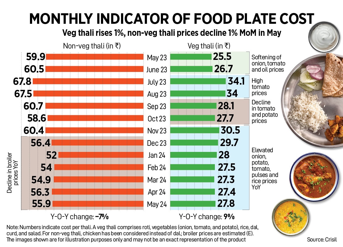 The average price of a representative home-cooked veg thali jumped by 9 percent in May, costing Rs27.8 as per Crisil MI&A Research estimates. The same thali cost Rs25.5 last May. However, compared to April, the pace of increase in cost is much slower (1 percent month-on-month) at Rs27.4 a plate.
