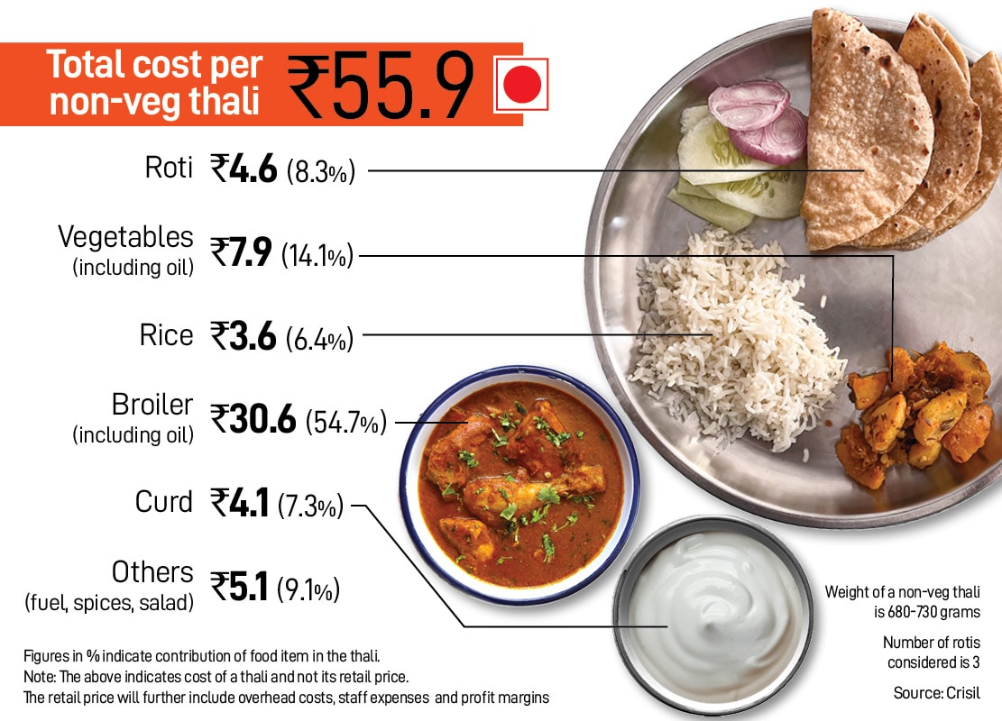 Meanwhile, cost of a representative home-cooked non-vegetarian thali declined by 7 percent in May. The non-vegetarian thali cost Rs55.9 compared to Rs59.9 last May. The decline in the cost of non-veg thali is due to an estimated 16 percent drop in broiler prices year-on-year on a high base of last fiscal. Prices of broilers account for 50 percent of a non-veg thali cost. Even on a monthly basis, the price of a non-vegetarian thali slipped by 1 percent. In April, a non-veg thali cost Rs56.3.