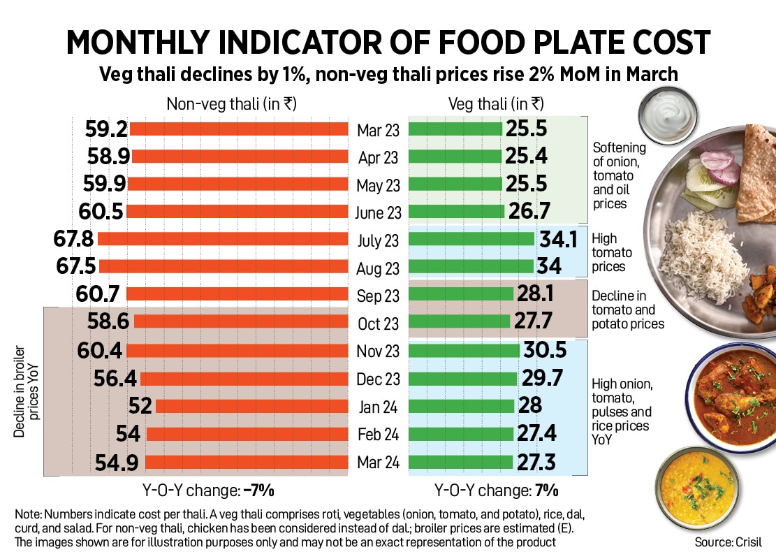 The average cost of the representative home-cooked vegetarian thali increased by 7 percent (year-on-year) in March to Rs27.3 as per Crisil MI&A Research estimates. The same thali cost Rs25.5 in March 2023. However, on a month-on-month basis, the thali’s price has dipped by merely 0.3 percent from Rs27.4.