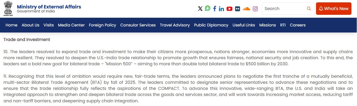 February 13, 2025: A joint statement by India and the US said that Prime Minister Narendra Modi and US President Donald Trump agreed to deepen the US-India trade relationship. As per the statement, the leaders set a bold new goal to more than double bilateral trade to $500 billion by 2030 from the current over $191 billion
