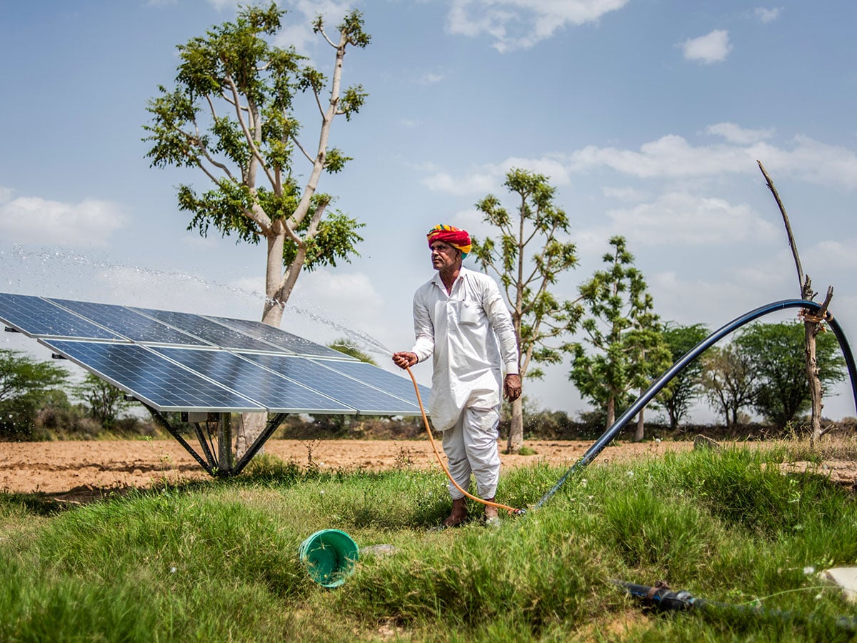 Indian farmer, cleans solar panels on his land, used to power a water pump and irrigation system for crops, in Solawata, Rajasthan, India. Image: Rebecca Conway/Getty Images