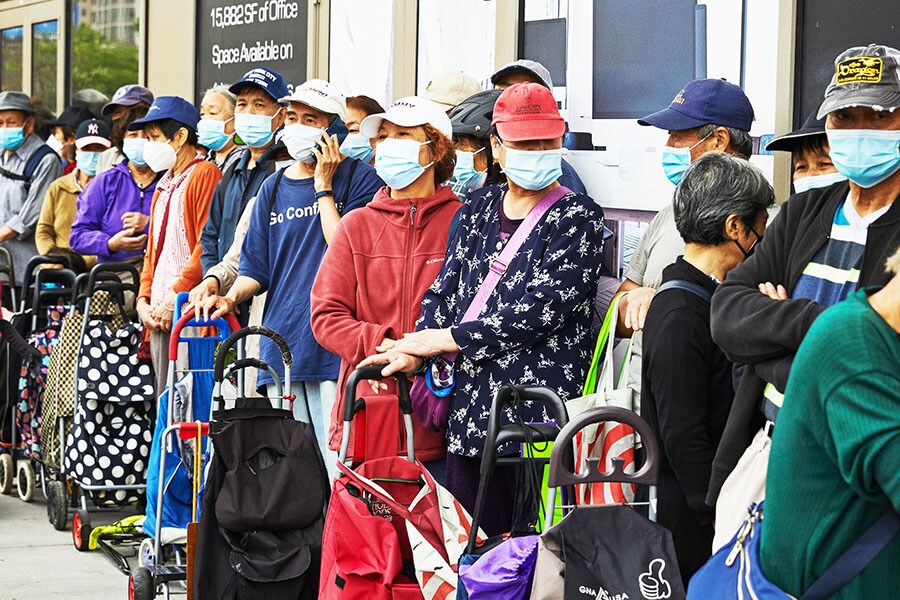 The morning line for a food bank run by the Philadelphia Chinatown Development Corporation, in Philadelphia, May 27, 2022. Many higher income households have been able to keep spending even as costs climb, but data and anecdotes suggest that lower-income households, despite the resilient job market, are struggling more profoundly with inflation. (Aaron Richter/The New York Times)