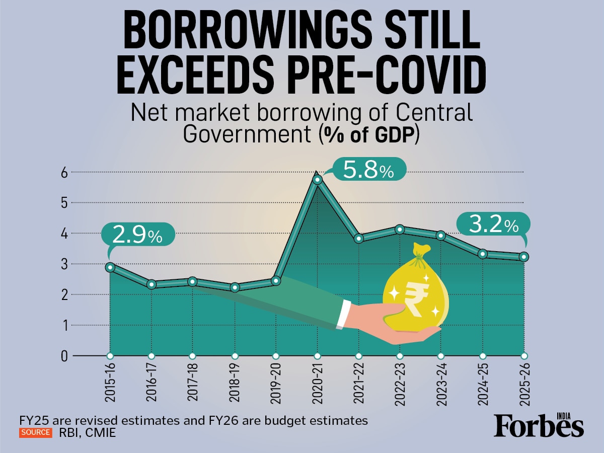 Market borrowings also remain high. At a budgeted 3.2 percent of GDP for FY26, net market borrowings are still significantly above the pre-pandemic level of 2.4 percent seen in FY20.