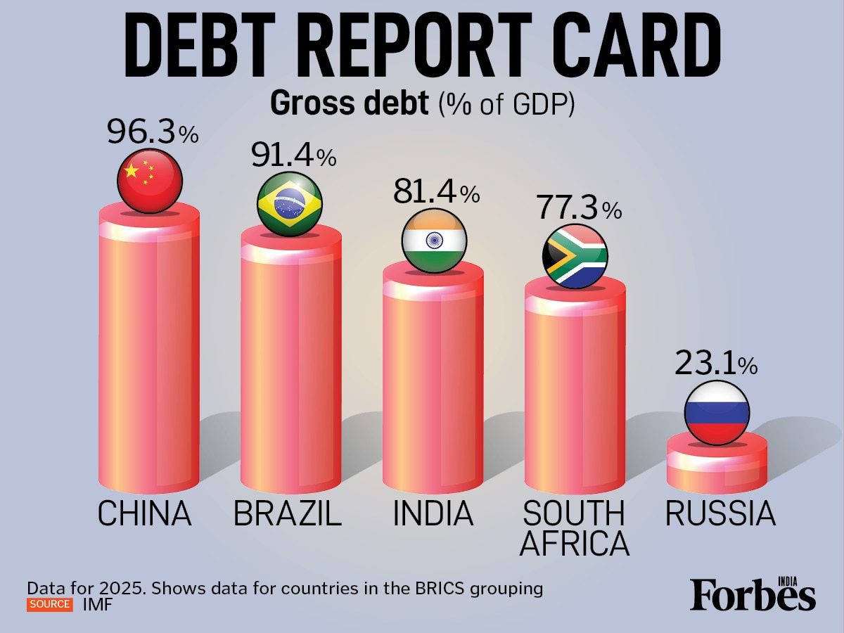 In a global context, India’s gross debt of 81.4 percent (including states) places it mid-pack among BRICS peers—lower than Brazil and China, but significantly higher than Russia.
