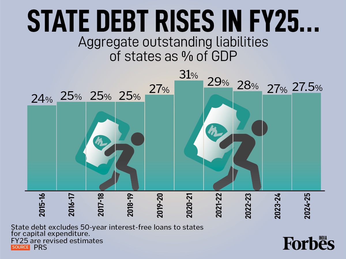 At an event last year, Finance Minister Nirmala Sitharaman urged states to mirror the Centre’s fiscal discipline, warning that failing to manage high-interest debt leads to borrowing for repayments rather than development. While aggregate state liabilities have increased in FY25 and remain higher than pre-pandemic levels, they are largely in line with the 15th Finance Commission’s target for FY25 (30.9 percent of GDP).