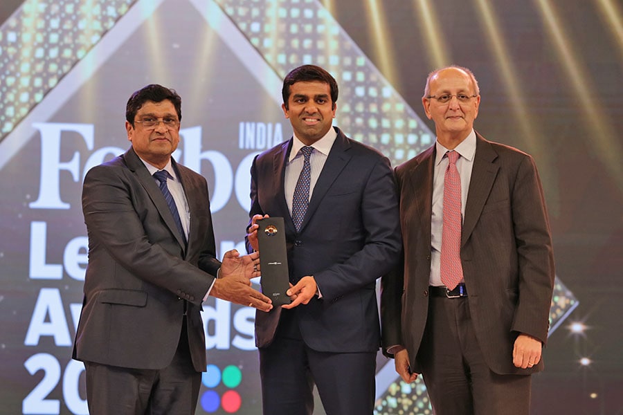 Parth Jindal, MD of JSW Cement & JSW Paints, is presented with the Gen-Next Entrepreneur Award by Andrew Holland, CEO of Avendus, and Angelo George, CEO of Bisleri.