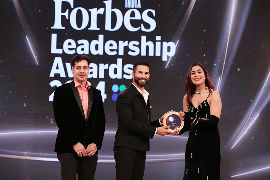 Actor Shahid Kapoor is presented with the Icon of Excellence Award by Ghazal Alagh, co-founder, Mamaearth as Forbes India"s Kunal Purandare looks on.