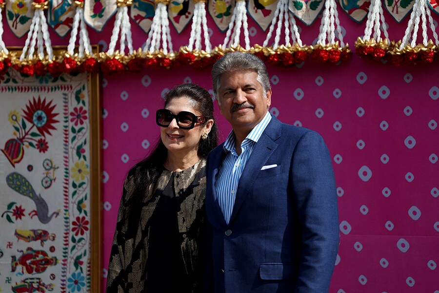 Anand Mahindra, Chairman of Mahindra Group, and his wife Anuradha Mahindra arrive to attend pre-wedding celebrations of Anant Ambani, son of Mukesh Ambani, the Chairman of Reliance Industries, and Radhika Merchant, daughter of industrialist Viren Merchant, at the airport in Jamnagar, Gujarat, India on March 1, 2024.
