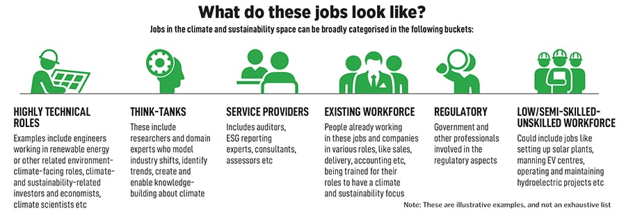 As India makes its green transition and companies adopt sustainability more aggressively, some of the jobs in demand will be climate finance-related disciplines, carbon budgeting, climate risk insurance, engineering roles, consulting and policy advisory.