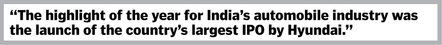 Still, the highlight of the year for India’s automobile industry was the launch of the country’s largest IPO by Korean auto giant Hyundai, which mopped up some ₹28,000 crore from the country. With that public listing, India’s four largest automakers, Maruti Suzuki, Hyundai Motors, Tata and Mahindra are all public companies, cornering between them as much as 80 percent of India’s automobile industry.